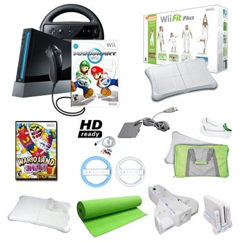 Whether they're young or old, expert gamers or beginners, Wii players will express themselves with intuitive motion control using the Wii Remote: a flick of the wrist to swing a baseball bat or tennis racket, a backswing and follow-through to send a golf ball flying over a pristine fairway.With Mario Kart Wii now included with the Wii hardware, players will be able to enjoy fun go-kart racing with Mario and all his Mushroom Kingdom pals right out of the box. The Wii Remote™ Plus controller, Nunchuk™ controller and Wii Wheel included in the package match the hardware.The sleek Wii console, no larger than a stack of several DVD cases, includes a Nintendo Wii game console (black), Wii Remote Plus controller (black), Nunchuk controller (black), Mario Kart, white Wii Wheel, wired sensor bar, power cord, standard composite cable, console stand, console manual. Wii is all about the motion controlled freedom and flexibility, and the new Wii Remote Plus Controller, included in this bundle in a matching white color scheme, is the new standard controller for the Wii gaming system. Combining the original accelerometer enabled motion-sensing abilities of the original iconic Wii Remote controller with with the expanded capabilities that were once only accessible through the Wii MotionPlus accessory, the compact Wii Remote Plus controller offers players precision motion controls all in one unit. Bundles Includes:* Nintendo Wii Console * Wii Remote Plus controller * Nunchuk controller * Mario Kart * Black Wii Wheel* Wired sensor bar* Power cord* Standard composite cable * Console stand * Console manual * Wii Fit Plus with Balance Board* HD Component Cable* Wario Land: Shake It* Multifunction Stand * White Steering Wheel* Blue Steering Wheel* Green Yoga Mat* Clear Silicone Case for Wii Fit Balance Board* Rechargeable Battery Pack for Wii Fit* Green 2 in 1 Read more customer reviews ...