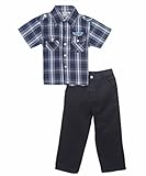 50 Fifty , Neat and complete, this 50 Fifty 2-piece is a great pick for the stylish little guy. The short-sleeved button-down has a classic plaid, button chest pockets and epaulettes, and a winged "Courage" patch on the chest. The matching twill pants have an elastic waistband, work pockets, and squiggly embroidery on the back pockets. Shirt 55% Cotton, 45% Polyester Jeans 100% Cotton Machine Wash Cold Made in Bangladesh ...